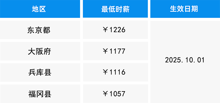 2025年,最新最低工资标准(时薪)为1023日元/时(冲绳县)—1226日元/时(东京都)不等。以下仅列举部分重点地区: