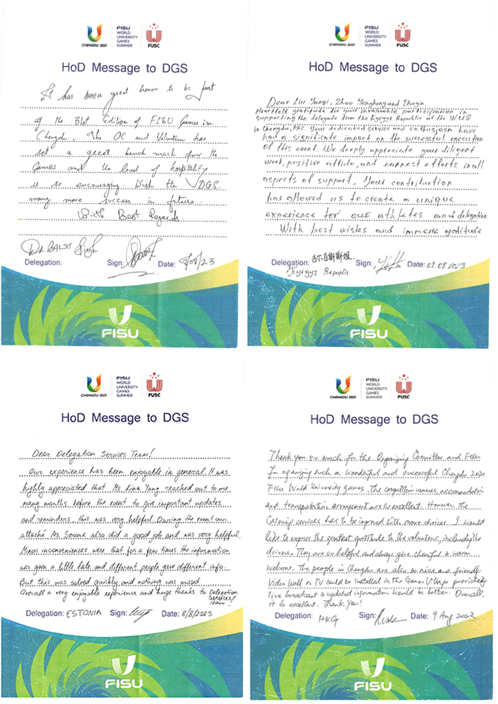 其中,法国代表团团长Xavier Dung这样评价,此次法国队的成都大运会之行,代表团服务团队给了他们很多支持,帮他们解决很多问题,“代表团服务工作人员在比赛、交通和城市形象树立等工作中都担任了非常重要的作用”。伊拉克代表团团长DOSKI Falah Saadoon Omer Ali也对大运会的充分准备而“震惊”,“我之前就知道中国是一个对赛事准备非常充分、很有组织的国家,无论是抵达成都当天,还是后续一系列行程,或是在大运村生活的这些天,代表团服务团队在岗位上倾情付出,给我们留下了深刻的印象,让我们有一种在家的感觉,也让比赛变得更有温度。”